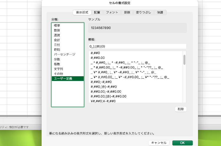 カスタム形式が原因でデータが正しく表示されない場合、「セルの書式設定」ダイアログの「ユーザー定義」タブで形式を確認し、必要に応じて修正します。