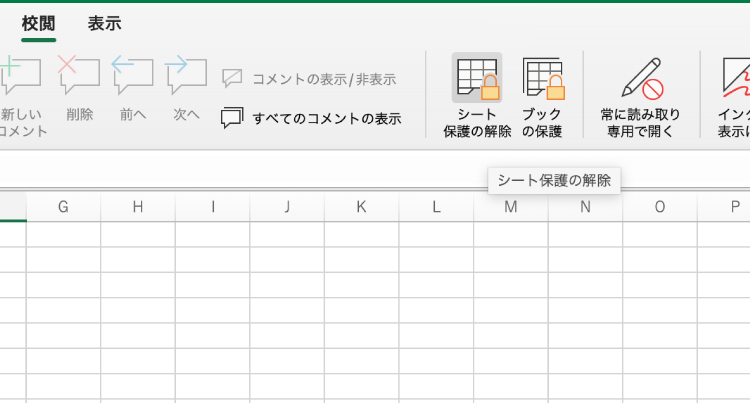シート保護がかかっている場合、「校閲」タブから「シート保護の解除」を選びます。セルが編集可能になり、データが表示されるようになります。